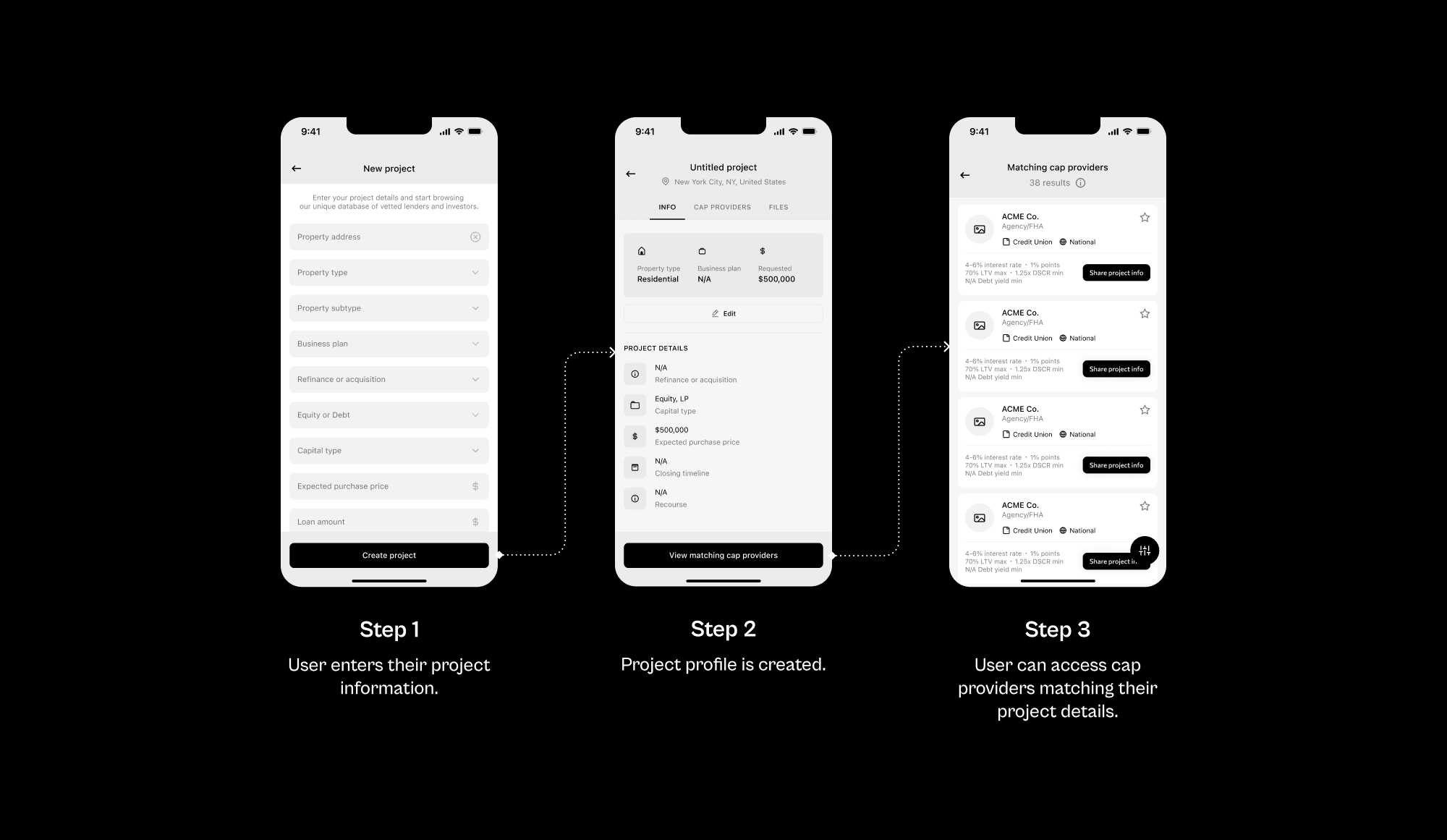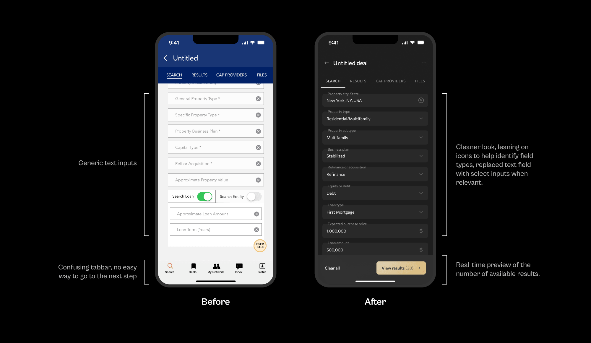 Finding commercial real estate deals typically involves hours of research, fragmented communication, and industry connections. CREED's vision: streamline this process with an intelligent search tool that matches users (investors or lenders) with relevant opportunities based on their criteria. The main pain points with the old search were: