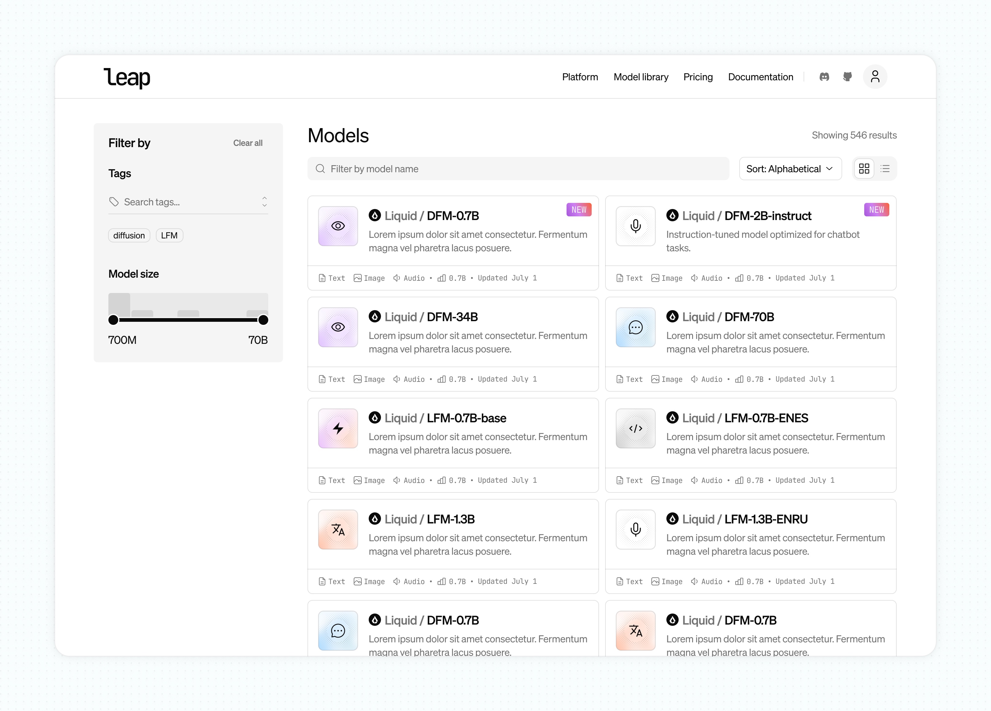 LEAP's core value proposition: helping developers quickly find the right model for their use case (chat, text-to-speech, embeddings, etc.). The Model Library was our first major feature.